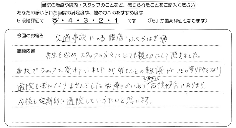 被害者様のお身体トラブルが軽快して日常生活に支障が無くなりますと、交通事故でのケガへの施術補償は終了となります。