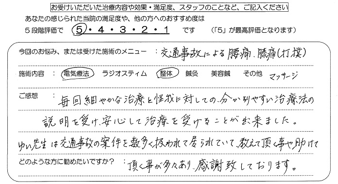 急性症状期のトラブルケアから中期症状時への施術ケア、症状軽快期に至る施術ケアまで、お身体トラブルの段階に応じた細やかな施術対応をしていただけるので、交通事故によるお身体の痛みに悩んでおられる方はゆい鍼灸整骨院に相談されることをおすすめします。